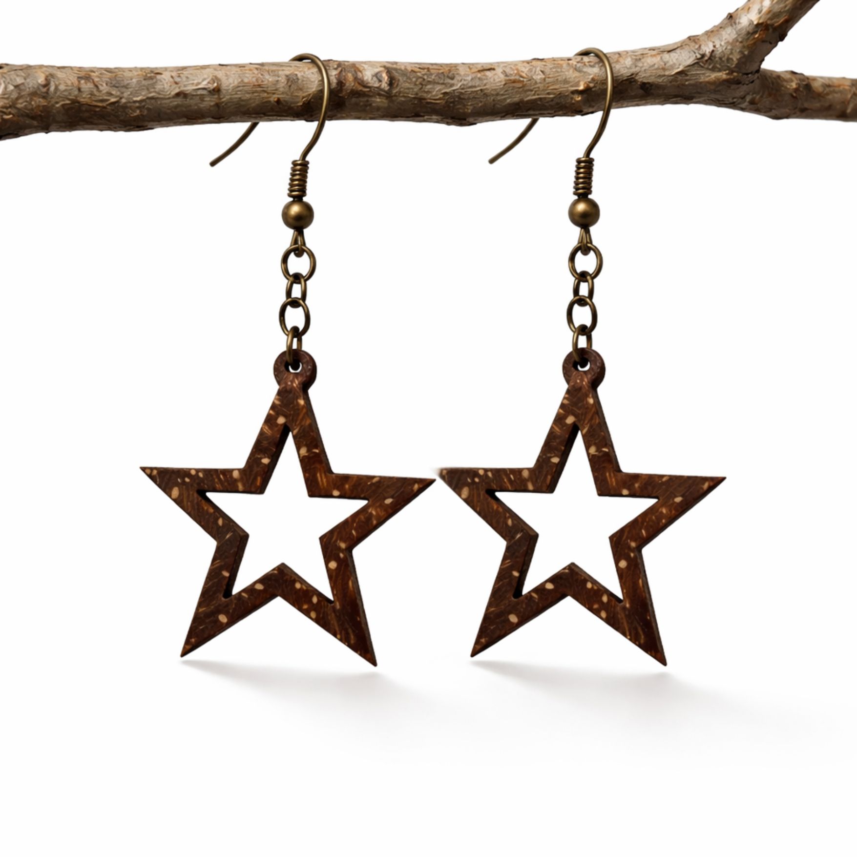 Each pair is carefully handmade by skilled artisans, highlighting the organic texture of coconut shell while shaping it into a charming star design inspired by nature and creativity.