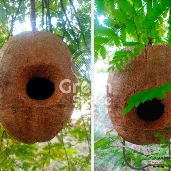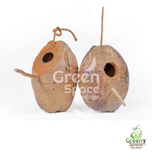 Properly dried, cleaned, and kernel-removed coconuts with Husk are crafted as nests and no substances harmful to animals are used for creating this 100% natural product. A coir twine rope is attached to the top of the nest and is ideal for handling even in smaller cages the door whole is made without sharp edges and a stick is stuck below the door whole for the bird to rest. This is very helpful in landscaping to create a natural garden for birds to live in.